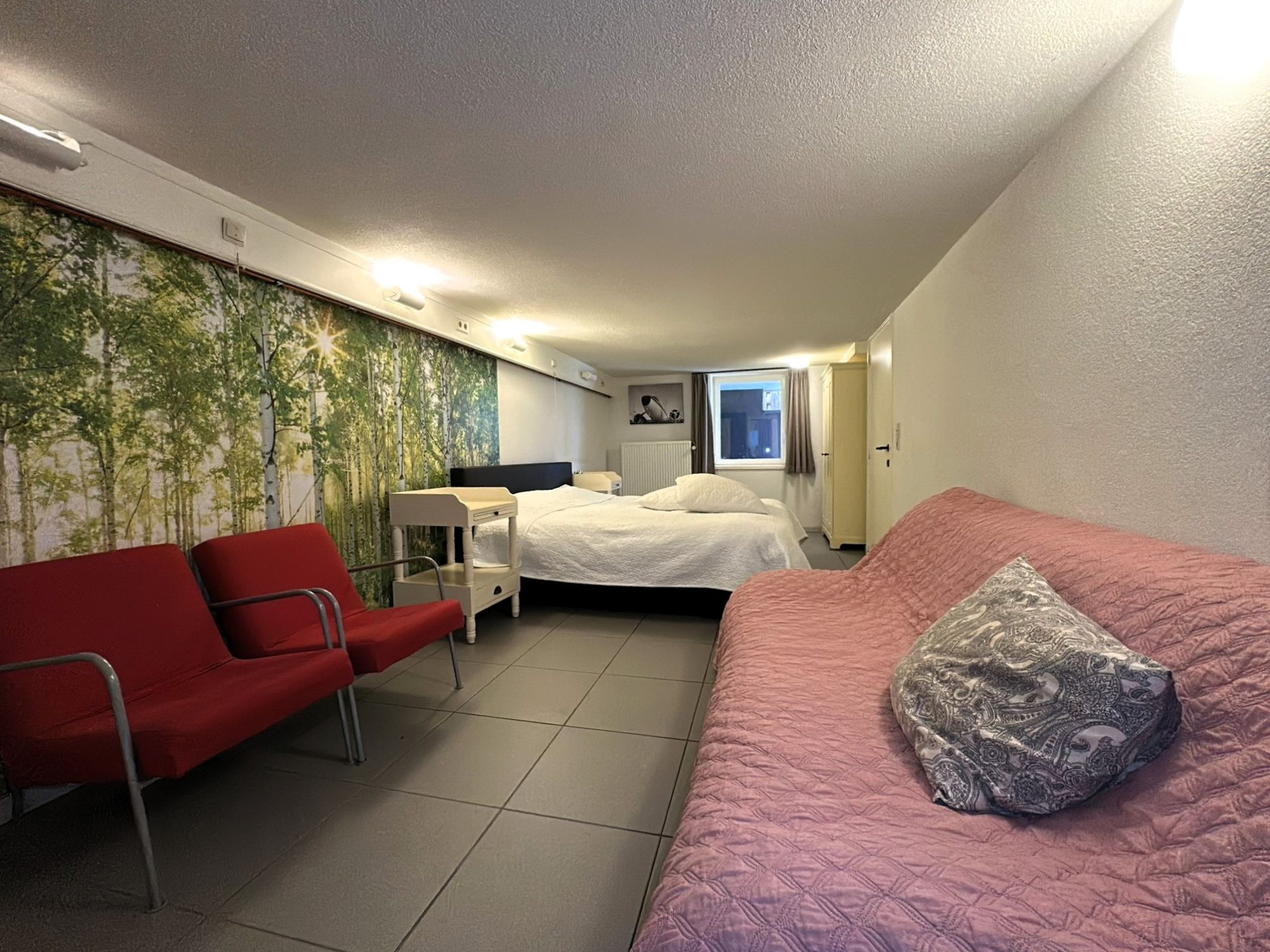 Woonkamer met breedbeeld TV, DVD speler, radio-cd speler. Internet aanwezig.
