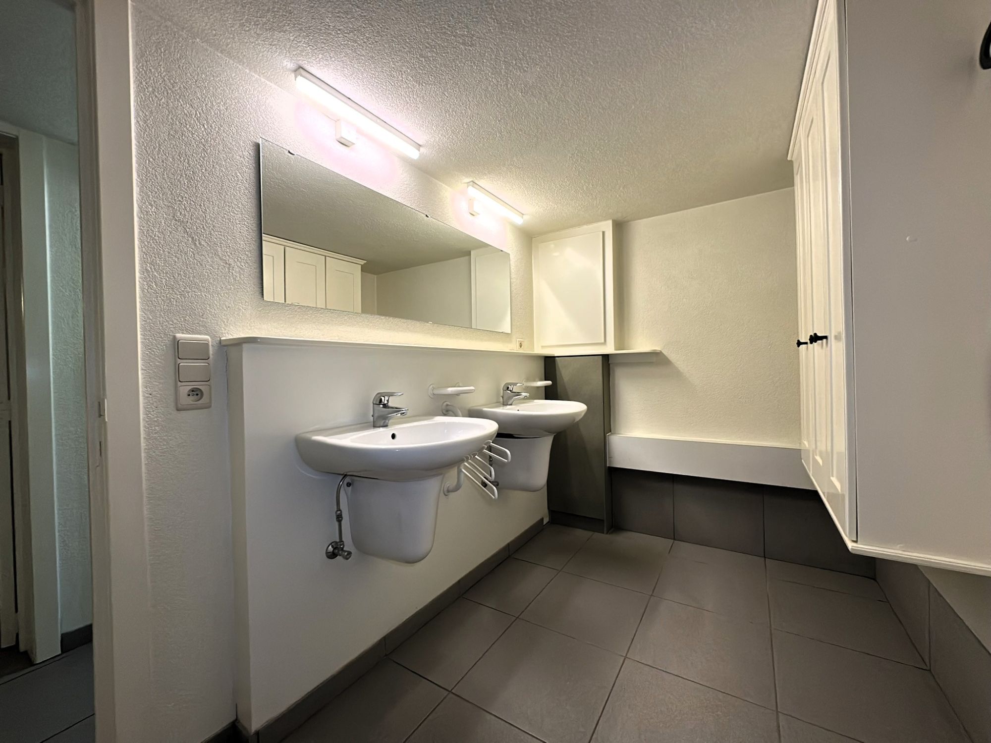 Badkamer met stoomdouche & bad, 2 wastafels en toilet.